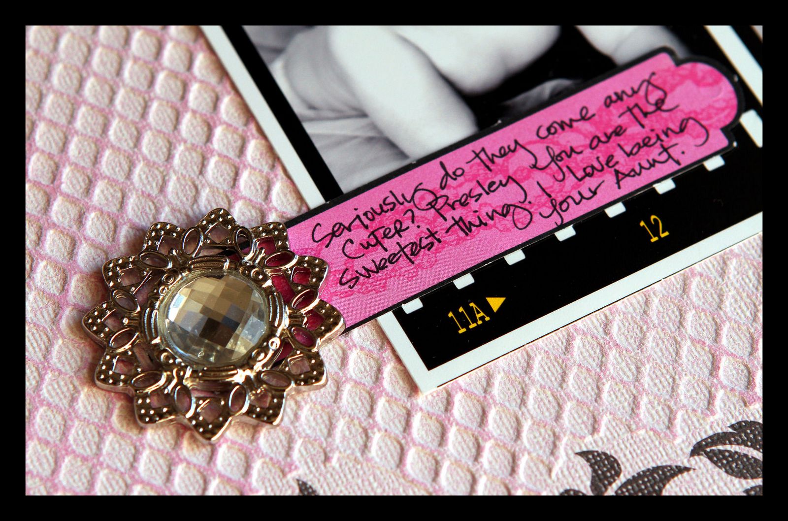 - Use the die cut journaling box to add your journaling. Adhere over the bottom of the first photo.