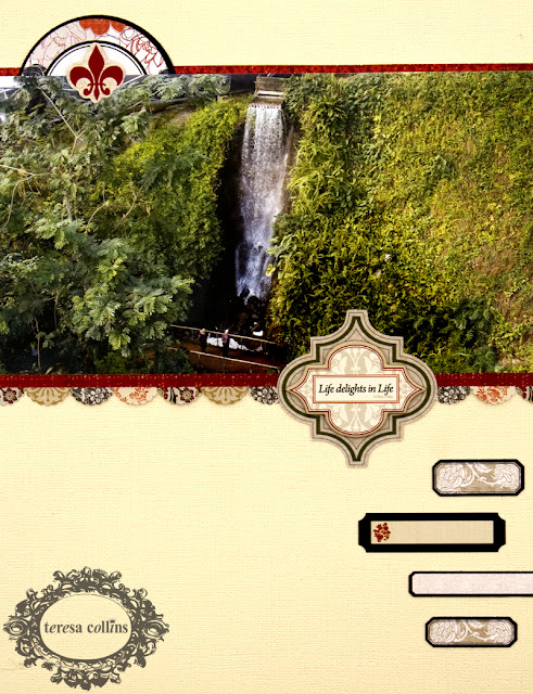 I wanted to use a large photo here as the photo was taken on a recent day trip to "The Eden Project" in Cornwall, UK. It is a photo of a waterfall taken from above the level of the rainforest canopy, so I wanted to give it perspective on the page. I enlarged my photo to measure 8 1/2" wide to fit the page size I wanted to create. The layout is based on a piece of 8 1/2" x 11" cream cardstock. The rest of the supplies are all from the Fabrications Linen collection.