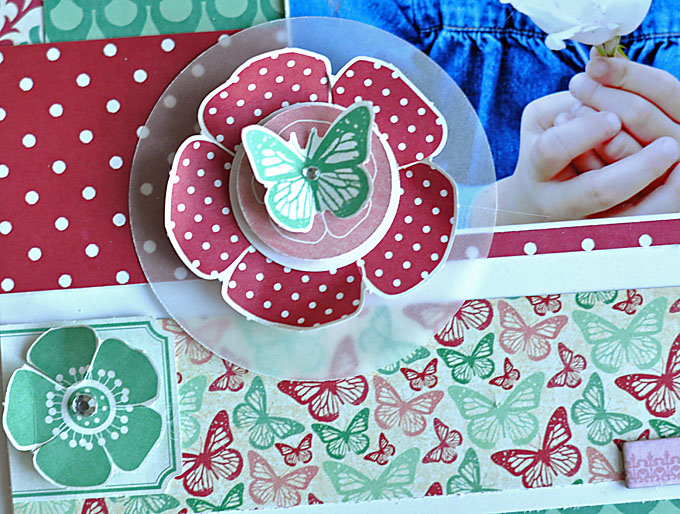 I still am a big fan of vellum! So perfect for adding just one more layer to any embellishment. I love how it helps to ground the element to the page. Here I created a pretty paper bloom simply using elements from the die cut sheet. I did cut the petals in between the large, and small paper flowers. Again, I used another label, and cut it down to adhere the smaller bloom on top. Finished the centers of the flowers, and butterflies with the Spring Fling Bling!