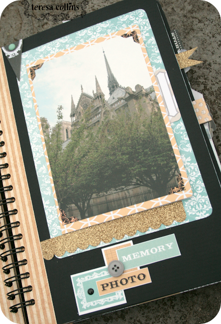 I used the collection Memorabilia. I really liked how well it went with the photos. There were two photos that inspired how I would create this book, the picture on the cover and the picture of the Eiffel tower. They both had a common key element that I knew I could pull into the entire book. They both had golden hues to them. So from my stash I created all of my base pages using a thick black card stock and also from my stash I had the golden striped paper. When I'm out and about I always look for timeless papers for just this purpose and I'm glad I had them! I cut all of my base pages then added strips of the striped paper to each page. I corner rounded only the out side edge corners. I knew by doing this that it would pull the entire book together. For my covers I used double thick black chipboard and did the same as the inner pages.